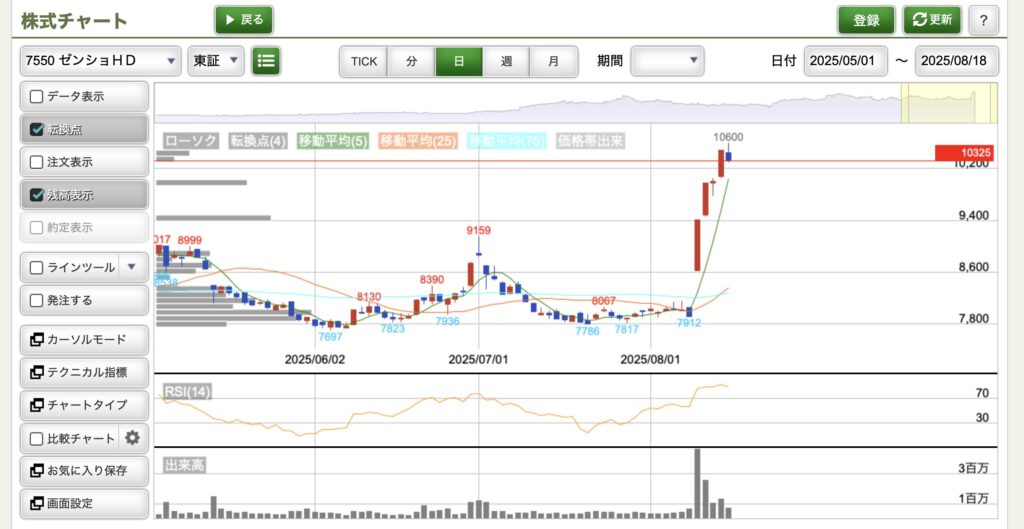 7550ゼンショーHDは割高感があるが、地合いが良いので本日は様子見。